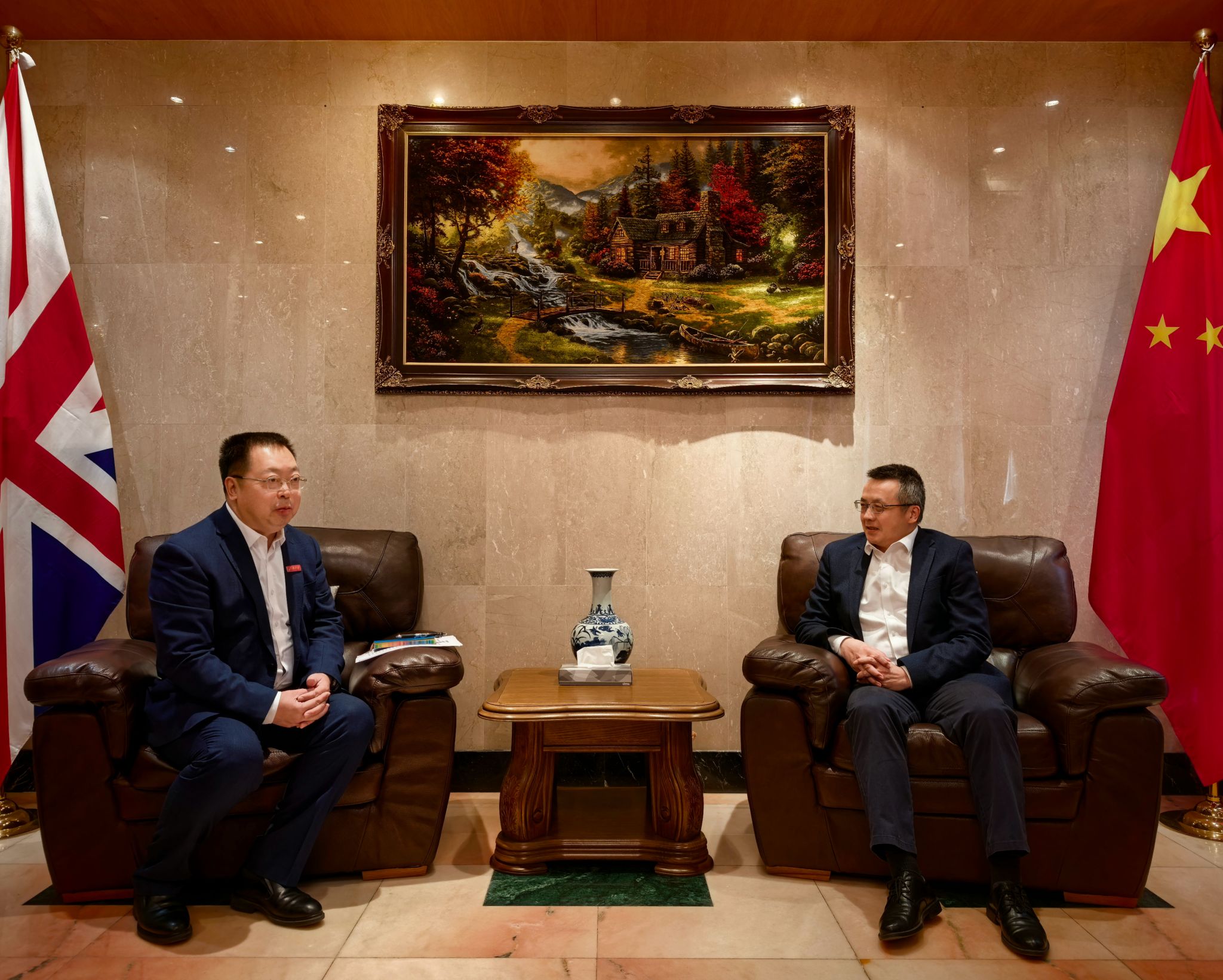 访问期间,代表团拜访了中国驻爱丁堡总领事馆,与张彪总领事座谈交流。刘宗明首先介绍了学校近年事业发展及此次访英情况,他表示学校重视对英合作,尤其是对苏格兰地区合作,目前学校已与格拉斯哥加里多尼亚大学建立深厚合作关系,希望后续可以在总领馆支持下进一步推动与苏格兰地区相关高校合作。张彪总领事对代表团到访总领馆表示欢迎,并介绍了苏格兰高等教育及对华合作基本情况,希望学校能发挥学科优势,开拓思路,在合作办学、科研合作等领域不断深化与苏格兰地区高校合作。